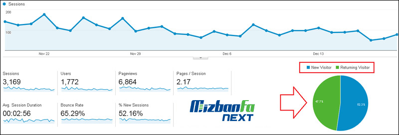 نمودار دایره ای سمت راست صفحه ، آماری در خصوص New Visitors و Returning Visitors یعنی بازدید کنندگان جدید و بازدیدکنندگان بازگشتی به سایت را نمایش می دهد. رنگ آبی نشان دهنده ی بازدید کنندگان جدید سایت شما می باشد که به تازگی با سایت شما آشنا شده اند و رنگ سبز نشان دهنده ی بازدید کنندگانی می باشد که از قبل سایت شما را می شناخته اند و مجدد به سایت بازگشته اند.