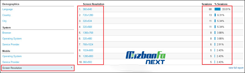 Screen Resolution: بخش بسیار مهمی می باشد که می توانید از طریق آن اطلاعات مفیدی در زمینه رسپانسیو کردن سایتتان برای دستگاه های موبایلی بدست آورید. برای مثال سایت ما در رزولوشن 640*360 بالاترین و بیشترین استفاده را داشته است و می توان طراحی رسپانسیو آن را بر اساس این ابعاد متمرکز کرد.