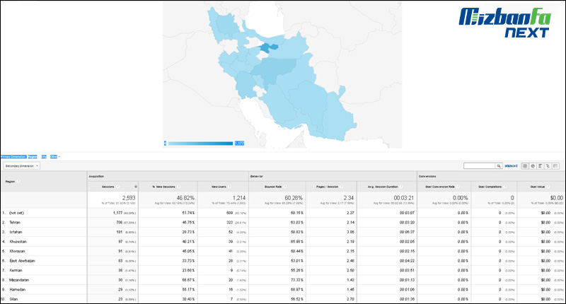برای دریافت اطلاعات بیشتر از موارد فوق که توضیح داده شد می توانید بر روی هرکدام کلیک نمایید تا ریز جزئیات آن ها نیز نمایش داده شود، برای مثال اگر از قسمت Country بر روی نام کشور iran کلیک کنید می توانید اطلاعات کاملی از مناطق مختلف و Session ها و … هم بر روی نقشه و هم جداول گزارشات مشاهده نمایید.