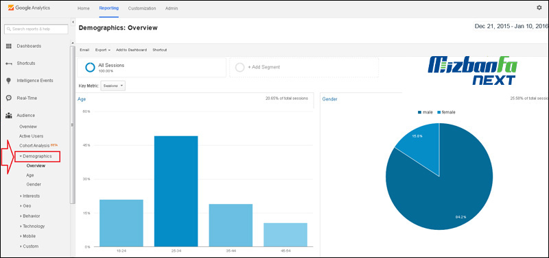 Audience>Demographics>Age گزارشات و آمار دقیق رنج سنی بازدیدکنندگان به همراه جزئیات Session ها و ….
