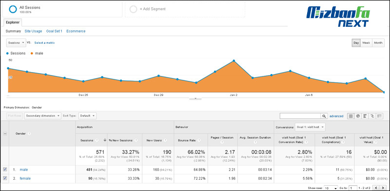 Audience>Demographics>Gender گزارشات و آمار دقیق جنسیت بازدید کنندگان به همراه جزئیات Session ها و …