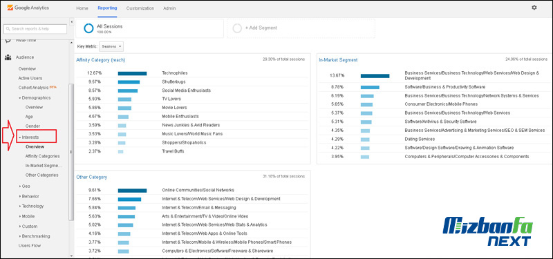 در این قسمت می توانید اطلاعاتی در خصوص علایق کاربرانی که از سایت شما بازدید می کنند بدست آورید . برای مثال اگر یک سایت فروشگاهی دارید و کاربرانتان به یک موضوع خاصی بیشتر علاقمند هستند می توانید محصولاتی مرتبط با همان موضوع را در لیست محصولاتتان قرار دهید.