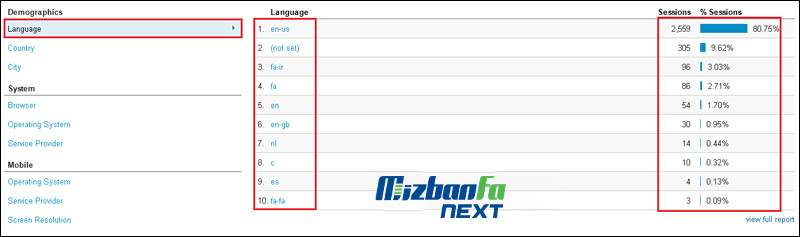Language: در این قسمت می توانید زبان کاربرانی که از سایت شما بازدید کرده اند را مشاهده نمایید. برای مثال en نشان دهنده ی زبان انگلیسی و fa زبان فارسی می باشد.