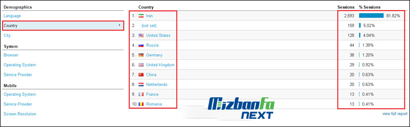 Country: در این قسمت می توانید مشاهده نمایید که افراد از چه کشور هایی وارد سایت شما شده اند، در این بخش گوگل آنالیتیک از cookie ها برای افراد استفاده می کند و از این طریق می تواند تشخیص بدهد که ما از ایران هستیم و بدین صورت سهم بیشتری از بازدید کنندگان ما را از ایران تشخیص می دهد که البته با توجه به این موضوع که در ایران اکثراً از VPN جهت دسترسی به سرویس گوگل آنالیتیک استفاده می کنند مشکلی هم وجود ندارد. این کار در واقع ضروری بوده و اگر از cookie ها استفاده نمی شد آمار دقیقی نمی توانستیم داشته باشیم.