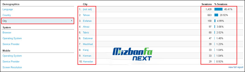 City: در این قسمت می توانید آمار بازدید کنندگان را بر اساس شهر مشاهده نمایید. مواردی که با not set مشخص شده اند بدین معنی می باشد که گوگل آنالیتیک نتوانسته است شهر مربوطه را تشخیص دهد.