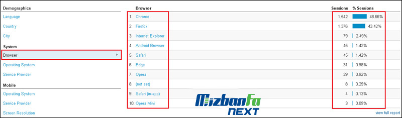 Browser: در این قسمت می توانید نوع مرورگری که کاربران در زمان دسترسی به سایت استفاده نموده اند را مشاهده نمایید. استفاده ی مفیدی که می توان از این قسمت کرد در خصوص بهینه سازی سایت برای سازگاری با مرورگر های پر استفاده تر می باشد. برای مثال طراحی سایت را بر اساس مرورگر گوگل کروم ورژن X که بیشتر مورد استفاده بوده است متمرکز نماییم