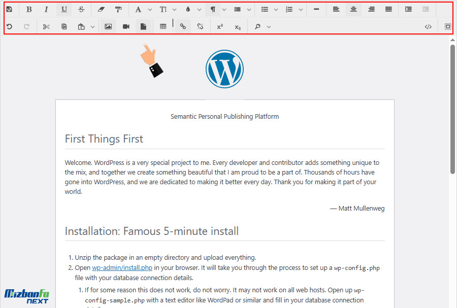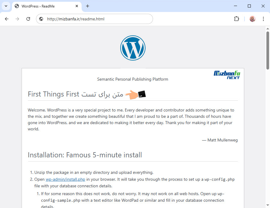 حالا اگر شما یه فایل html داشته باشین و تصمیم داشته باشین اون را داخل هاست به صورت آنلاین ویرایش کنید میتونین از ویرایشگر حرفه ای html editor استفاده کنید، مثلا همونطوری که میبنین ما الان اینجا یه فایل داریم تحت عنوان readme.html و اگر بخوایم نتیجه اجرایی فایل را مشاهده کنیم میریم و داخل مرورگر و آدرس فایل را تایپ می کنیم mizbanfa.ir/readme.html و همونطور که میبینید این یه صفحه html خیلی ساده است که از قسمت های مختلفی تشکیل شد و لوگو وردپرس هم اون بالا قرار گرفته.