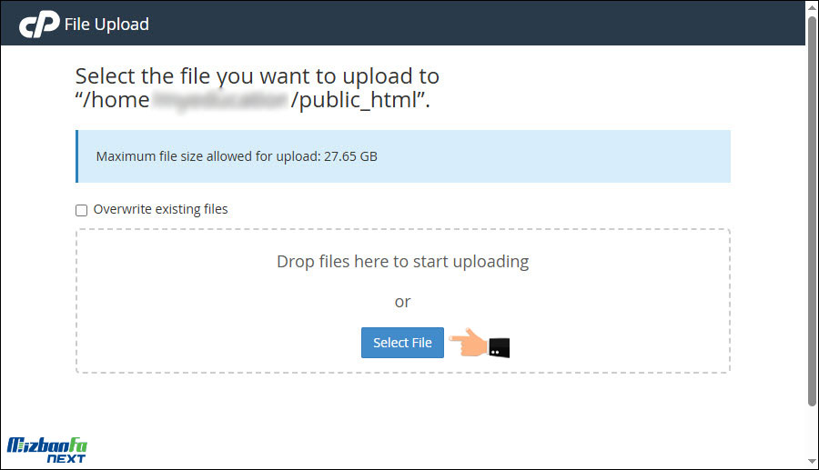 حالا در صفحه باز شده با کلیک روی دکمه Select File، فایل مورد نظرتون رو جهت آپلود شدن انتخاب کنید همچنین میتونید فایل را روی کادر خط چین درگ کنید تا آپلود بشه. پیشنهاد میکنیم ویدیوی آموزشی نحوه آپلود فایل در سی پنل را مشاهده کنید.