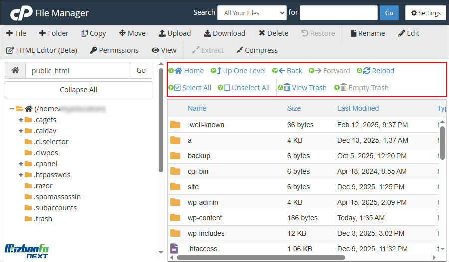 - توسط up one level قادر هستیم از مسیری که داخلش قرار داریم به یک مسیر قبل تر برگردیم، مثلا وقتی داخل public_html هستیم با کلیک کردن روی این قسمت به مسیر قبل تر یعنی Home منتقل میشیم.