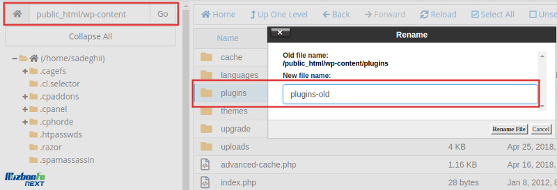 برای اینکار کافیه وارد File Manager هاست خودتون شده و سپس به مسیر public_html/wp-content مراجعه کنید. حالا پوشه plugins را به یک نام دلخواه دیگه مثل plugins-old تغییر داده و ذخیره کنید. برای این کار روی پوشه راست کلیک کرده و گزینه Rename را انتخاب کنید.