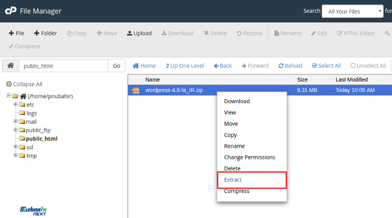 بعد از این مرحله روی فایل zip راست کلیک کرده و گزینه Extract را انتخاب کنید. بعد از اینکه فایل zip وردپرس از حالت فشرده خارج شد پوشهای به اسم wordpress اضافه خواهد شد.