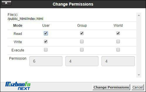 اگر سطح دسترسی برای فایل ها و پوشه های شما چیزی به غیر این موارد هست با انتخاب فایل ها و پوشه های مورد نظر روی آنها راست کلیک کرده و سپس روی گزینه Changes Permissions کلیک کنید. حالا در پنجره ای که باز میشه تیک گزینه های Read و Write و Execute را به شکلی فعال و غیرفعال کنید که در نهایت در بخش Permission سطح دسترسی مجازی که پیش تر اعلام کردید اعطا بشه.