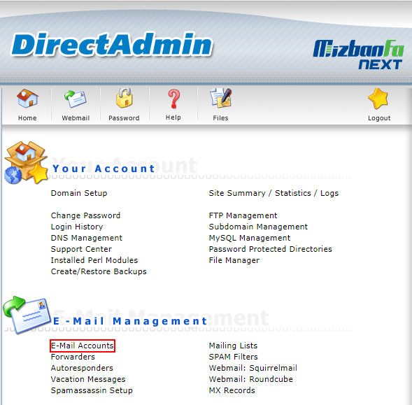 در ابتدا طبق آموزش ورود به دایرکت ادمین وارد کنترل پنل هاست دایرکت ادمین شده و سپس مشابه تصویر زیر از بخش E-Mail-Management گزینه E-Mail Accounts را انتخاب کنید.