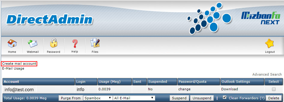 در صفحه جدیدی که براتون باز میشه، اکانتهای ایمیلی که از قبل ایجاد شده را خواهید دید که برای ساخت اکانت ایمیل در هاست دایرکت ادمین باید روی گزینه Create mail account کلیک کنید.