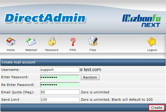در مرحله بعد وارد صفحهای خواهید شد که در این مرحله باید نام کاربری و رمز عبور اکانت ایمیل را به همراه یکسری از تنظیمات وارد کنید. به این صورت که در کادر روبروی Username نام کاربری، Enter Password رمز عبور و Re-Enter Password تکرار رمز عبور، Email Quota (Meg) اندازه فضای لازم بر حسب مگابایت برای ذخیره و ارسال دریافت ایمیلها و برای Send Limit هم حداکثر تعداد مجاز ارسال ایمیل در طول یک روز را وارد کنید. سپس روی دکمه Create کلیک نمایید. اگر برای Email Quota (Meg) و Send Limit مقدار 0 وارد شود یعنی محدودیتی اعمال نشه.