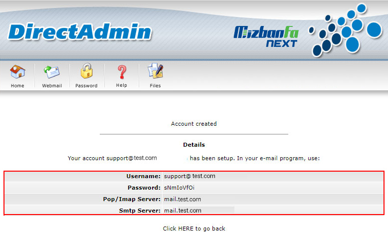 بعد از کلیک روی دکمه Create اکانت ایمیل در هاست دایرکت ادمین ساخته شده و مشخصات اکانت ایمیل که شامل نام کاربری ایمیل، رمز ایمیل و آدرسهای سرویسهای pop3 و smtp مشابه تصویر زیر نمایش داده خواهند شد.