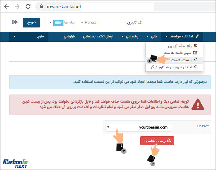 - برای برگرداندن هاست مانند روز اول می بایست به ناحیه کاربری خود وارد شوید.