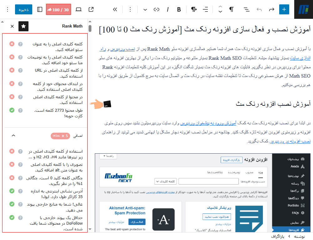 درنهایت زمانیکه به بخش نوشته یا برگه های وردپرس مراجعه میکنید، رنک مث مثل یک ناظر همه فن حریف محتوای شما را بررسی میکنه و هر جا نیاز به بهبود داشته باشه به شما پیشنهاد میده.