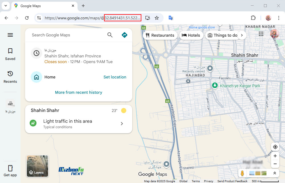 اگر به این اطلاعات دسترسی ندارید نقشه گوگل مپ کسب و کار را باز کنید (اصولا این نقشه در صفحات تماس با ما یا درباره ما درج شده). مطمئن شوید که محل کسب و کارتان که قبلا در گوگل مپ ثبت شده را انتخاب کردید حالا در آدرس بار اعداد مقابل @ تا , را انتخاب و در فیلد مختصات جغرافیایی درج کنید.