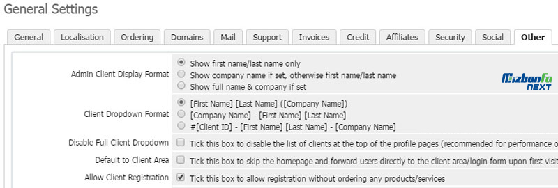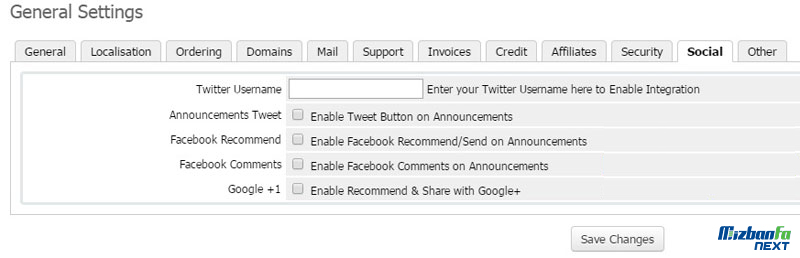 - Social: در این قسمت می توانید WHMCS را برای تعامل در شبکه های اجتماعی پیکربندی نمایید.