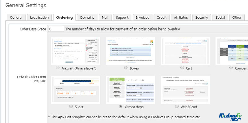 - Ordering: در این بخش می توانید تنظیمات مربوط به آدرس TOS (Terms of Service) یا همان قوانین که در پایان فرایند سفارش به کاربر نمایش داده می شود و سایر تنظیمات ویژه می باشد.