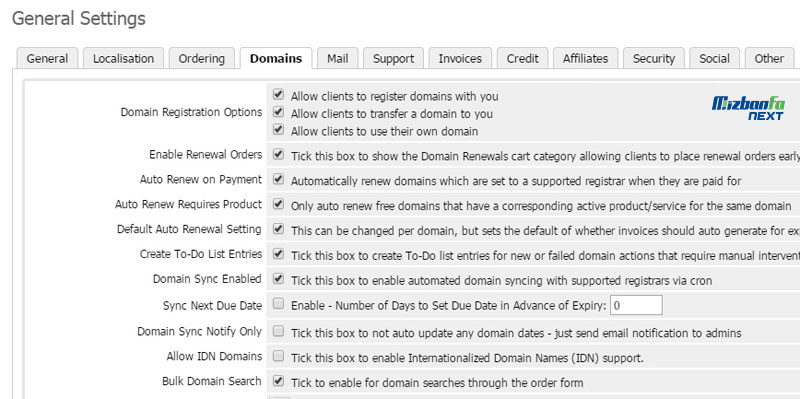 - Domains: در این بخش می توانید تنظیمات مربوط به ثبت دامنه، قیمت گذاری و … را پیکربندی نمایید.