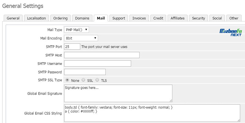 - Mail: در این قسمت می توانید روش مورد استفاده برای ارسال ایمیل، تعریف امضای پیش فرض و سایر تنظیمات مربوط به ایمیل را پیکربندی نمایید.