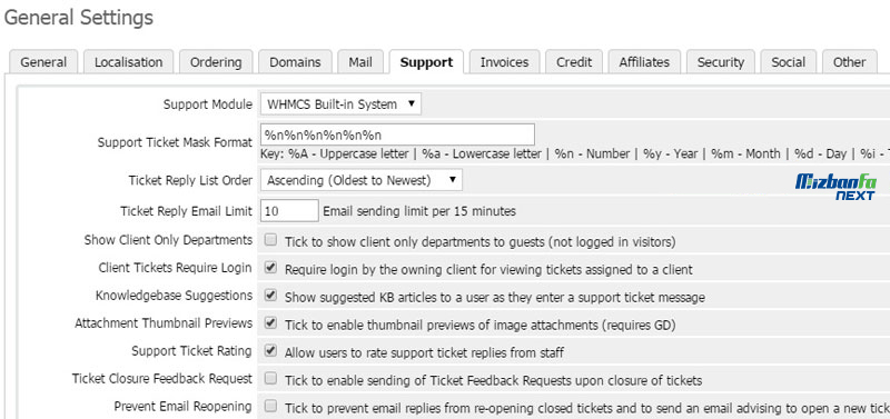 - Support: در این قسمت می توانید تیکت های پشتیبانی که نمایش داده می شوند را سفارشی سازی نمایید و نوع پیوست هایی که کاربران مجاز به ارسال آن ها می باشند را تنظیم نمایید.