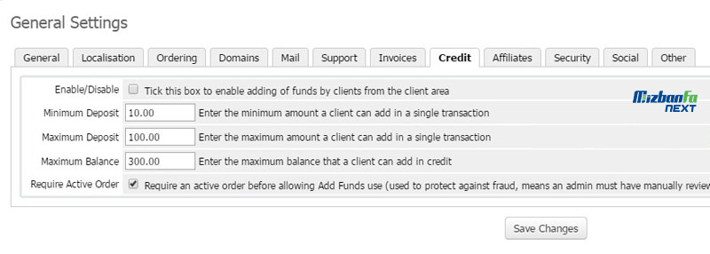 - Credit: در این قسمت می توانید ویژگی موجودی اعتبار در ناحیه کاربری را فعال و غیر فعال نمایید و محدودیت ها را تنظیم نمایید.