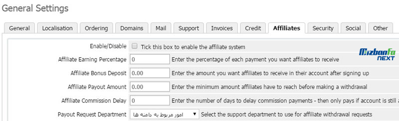 - Affiliates: در این قسمت می توانید ویژگی های فروش رابطه ای یا بواسطه بازاریابان را پیکربندی نمایید.