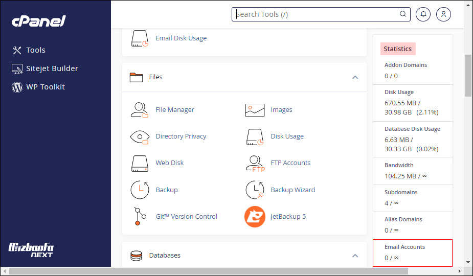 تعداد مجاز این موارد هم در بخش Statistics قابل مشاهده هست و به راحتی میتونید تعداد مجاز و همچنین تعداد مصرف شده و باقی مانده برای ساخت اکانت ایمیل و دیتابیس را مشاهده کنید. مثلا در تصویر زیر نماد بی نهایت را میبینیم یعنی هر تعداد دلخواهی که مد نظر داریم میتونیم دیتابیس و واکانت ایمیل بسازیم.