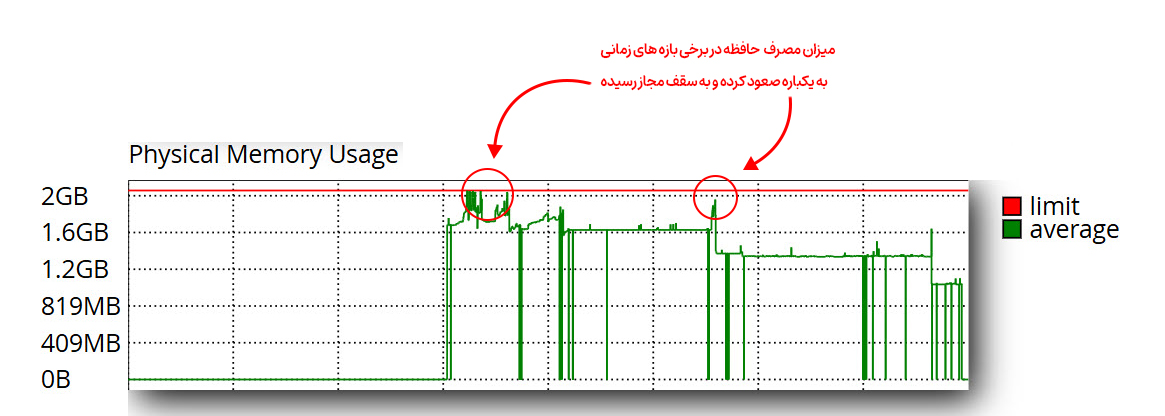 با بررسی سایر گراف ها متوجه شدیم که مصرف حافظه هم در چند بازه زمانی صعودی بوده و به سقف مجاز خودش رسیده یعنی هاست با کمبود منابع پردازشی رم و پردازنده مواجه شده. و در ادامه این نمودار نزولی بوده.