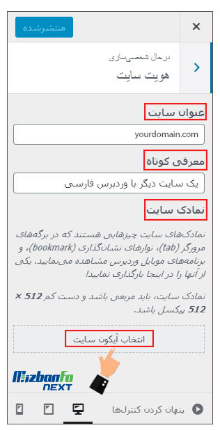 سپس با کلیک روی «انتخاب آیکون سایت» لوگو یا هر آیکون دیگری که قرار است وب سایتتان با آن شناخته شود را وارد نمایید. نمادک در کنار برگه های مرورگر سیستم یا گوشی های تلفن همراه و نوارهای نشانگذاری قابل مشاهده خواهد بود. پس در انتخاب آن دقت لازم را داشته باشید.