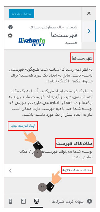 مدیریت ظاهر فهرست ها در صفحات از طریق این بخش امکان پذیر است. اگر شما پیش تر فهرست یا فهرست های خود را ایجاد کرده اید می توانید در بخش «فهرست ها» آنها را مشاهده نمایید. اما اگر هنوز فهرستی را ایجاد نکرده اید با کلیک روی دکمه «ایجاد فهرست جدید» اقدام به ساخت فهرست یا فهرست های مورد نظر خود نمایید. در نظر داشته باشید که نحوه نمایش و جایگاه فهرست هایی که می توانید ایجاد کنید به نوع قالب انتخابی شما و ویژگی های آن بستگی دارد.
