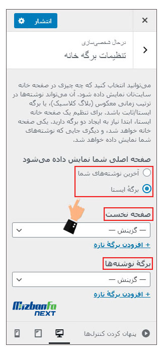با انتخاب مورد اول هر محتوایی که به وب سایت خود اضافه می کنید به صورت خودکار در صفحه خانه نمایش داده می شود. اما در صورت انتخاب برگه ایستا باید مشخص کنید که در «صفحه نخست» و «برگه نوشته ها» چه مواردی نمایش داده شود.